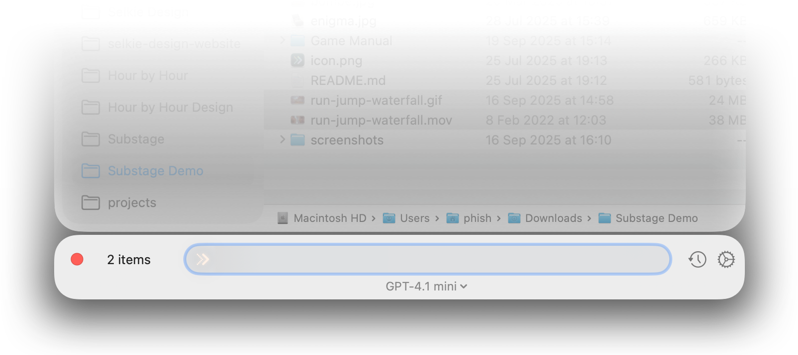 Substage helps you work with files and folders on your Mac by translating natural language into terminal commands. To do this, it sends your prompt - plus some context - to AI providers such as OpenAI, Anthropic, Mistral, and Google.